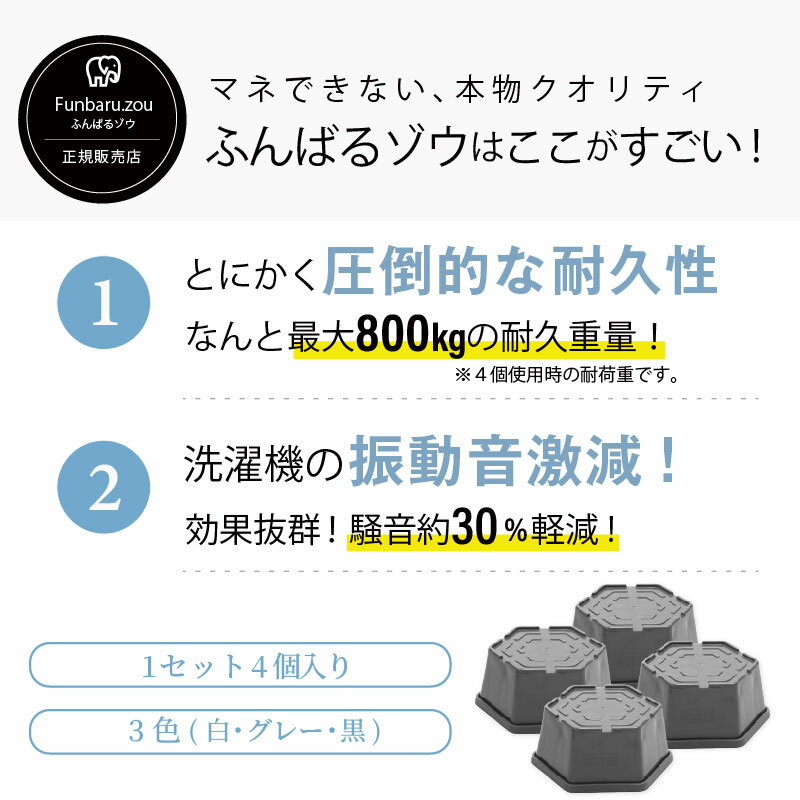 【楽天1位&高評価★4.59】洗濯機かさ上げ台 防音 防振 ふんばるゾウ 正規品 4個セット 【特許&意匠登録出願中】高耐久 かさあげ 台 高さ調整 かさ増し キズ凹み防止 振動防止 ドラム式 縦型 底上げ台 洗濯機用防振台 洗濯機台 洗濯機 置き台 ズレ防止 底上げ 洗濯機下 掃除