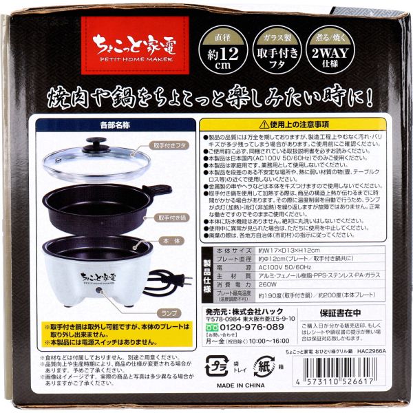 ギフトサービスについて株式会社ハック個装サイズ:160X150X160mm個装重量:約708g内容量:1セット入ケースサイズ:52.5X69X35cmケース重量:約19kg製造国:中国【発売元:株式会社ハック】【サイズ】本体:約W17×D13×H12cm、プレート・取手付き鍋:約Φ12cm【電源】AC100V 50/60Hz【主材質】アルミ、フェノール樹脂、PPS、ステンレス、PA、ガラス【消費...