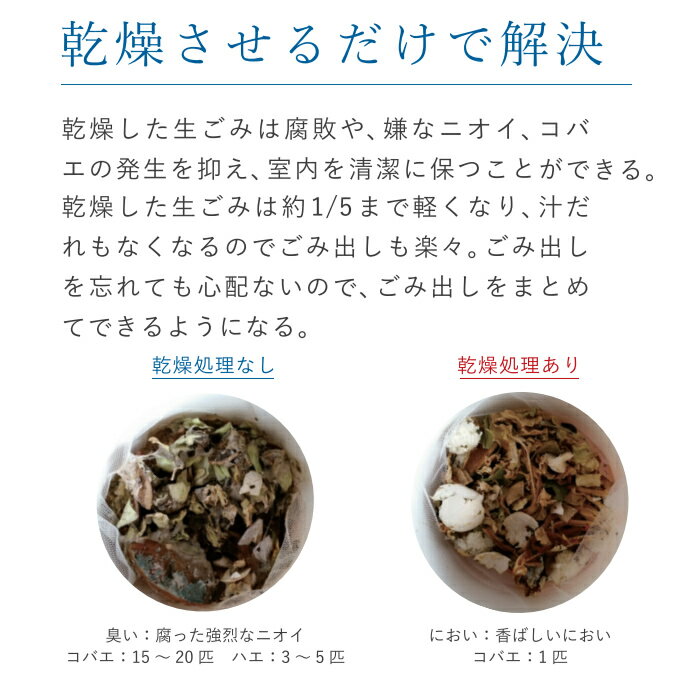 生ごみを乾燥させ、枯葉のようにパリパリに乾燥処理した生ごみは枯葉のようにパリパリになり、重量は約1/5まで軽くなります。腐敗しないため、臭い、コバエの発生を抑え、雑菌の繁殖もせず、室内に本当の清潔さを取り戻すことができます。部屋の中でのごみの長期保管も容易となり、ごみ出しの際も、臭いも重さも汁だれも気になりません。有機質肥料にも使える乾燥した生ごみを細かく砕けば、土に埋める場合、深い穴を掘らなくて...