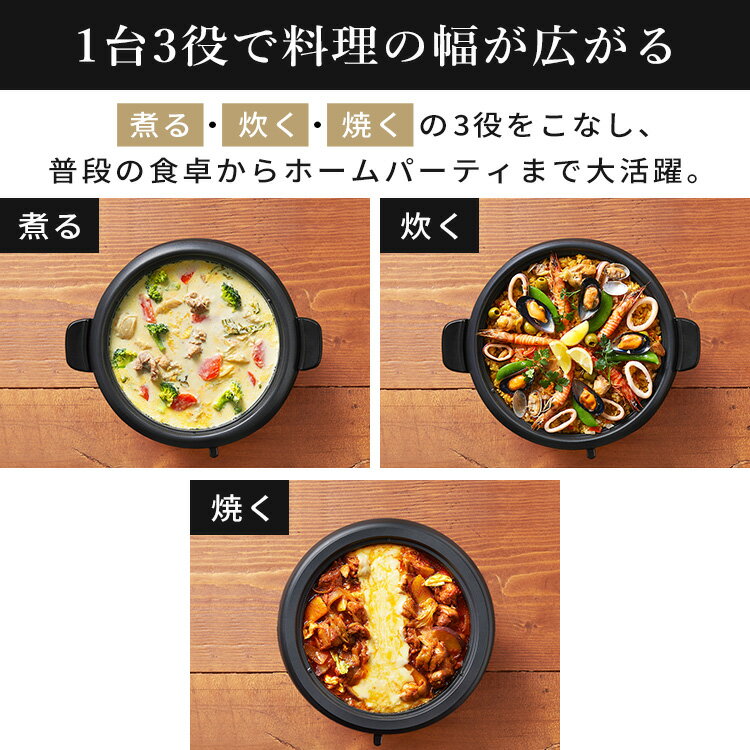 煮る・炊く・焼くの3役をこなし、普段の食卓からホームパーティまで大活躍。◆ おたまのちょい置きに便利フタの持ち手の凹部分はおたまが置ける仕様に。調理中のちょっと置きたいを解決してくれます。◆ 最大約250℃の高温で美味しく焼き上げる保温から約250℃まで無段階で温度調節ができるので、料理のバリエーションも広がります。◆ お手入れ簡単着脱式だから、プレートを外して丸洗いが可能。フッ素コーティングで焦...