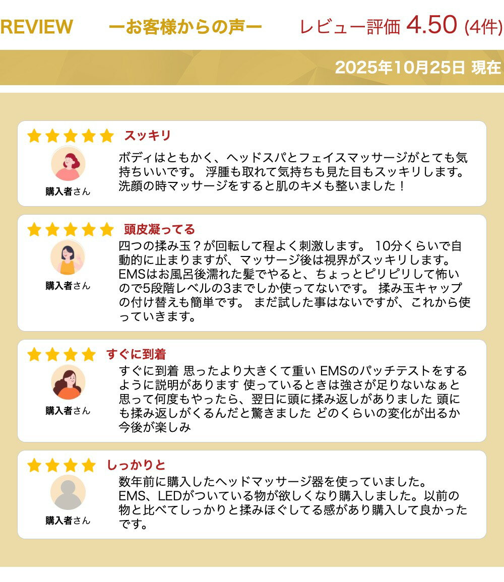 注意事項 危険な事柄について ※本製品は、抜け毛、薄毛、たるみ、肩こり などの治療を目的とした医療機器ではございません。 頭皮の地肌ケアを目的とした一般家庭用機器です。 ※本製品は、治療を目的とした ヘッドマッサージ器、ヘッドマッサージャー、ヘッドマッサージ機、頭皮マッサージ器 ではありません。 ※医師から、マッサージ機の使用を禁じられている方はご使用をお控えください。 ※他のマッサージ機器との併...